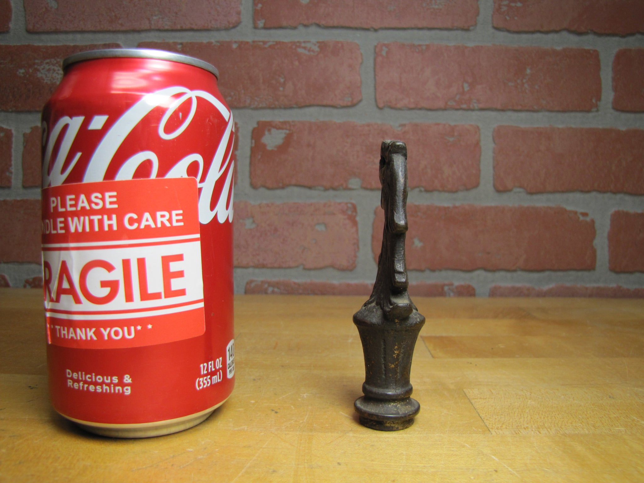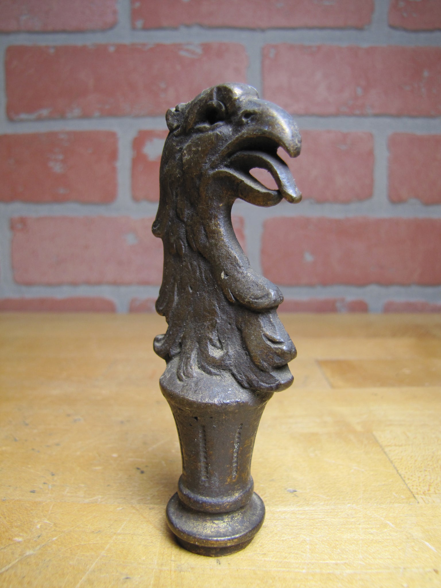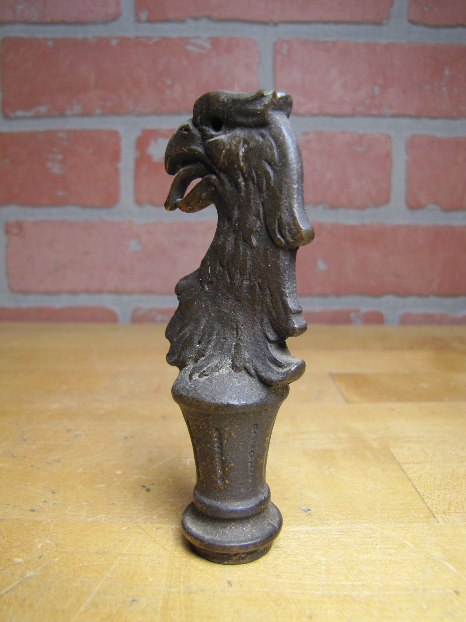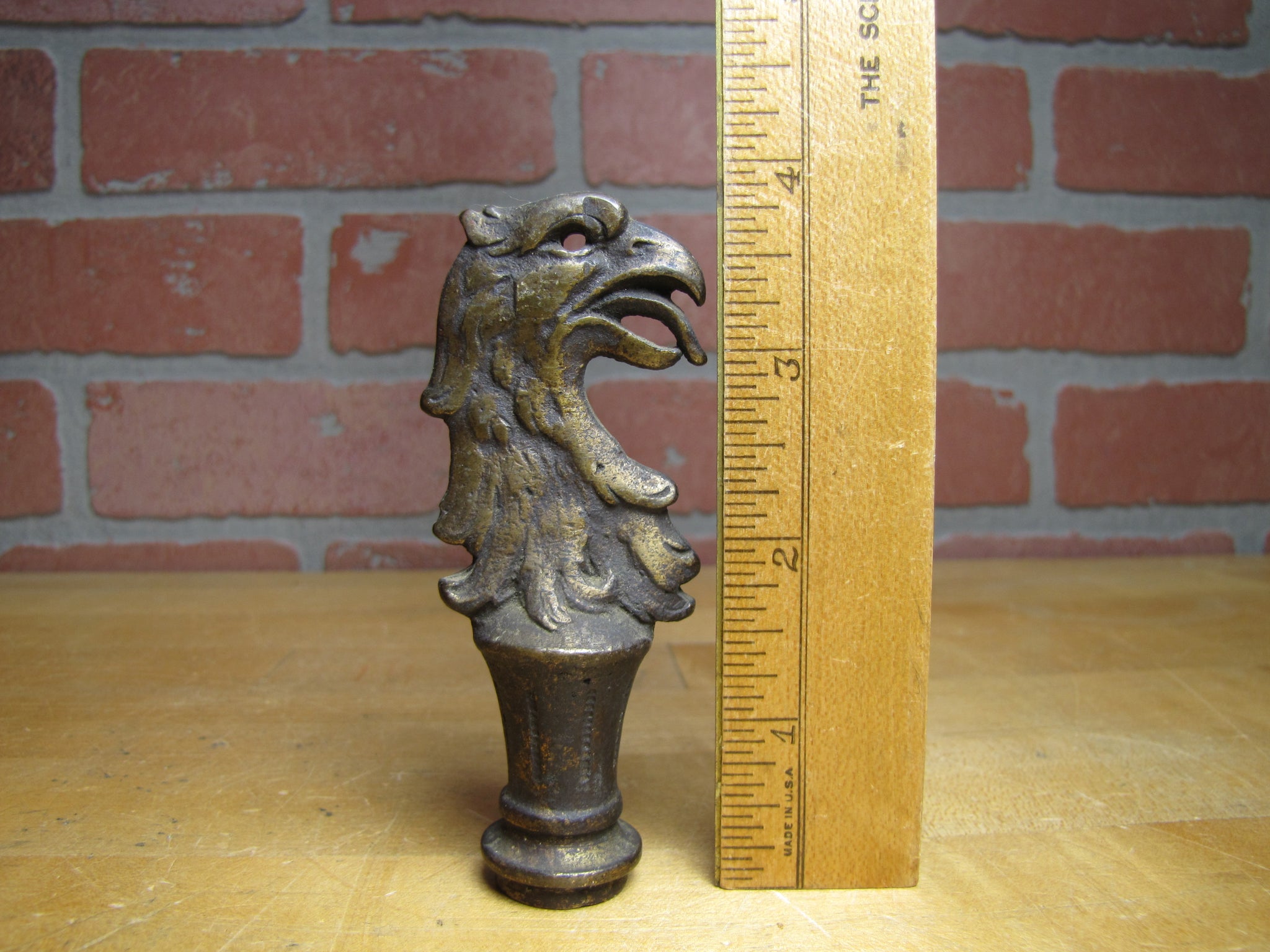 EAGLE Old Brass Decorative Arts Figural Birds Head Tongue Out Feathers Finial. Approximately 3 7/8" Tall. Reference photos next to 12 oz can to help judge size. Please view all pictures for additional information. Exhibits wear associated with age and use. Threads untested. Wonderful piece for display reuse repurpose. Check our store for more old hardware and decorative arts. Available for private inspection by appointment. sold as shown. please ask all questions before end of auction. available for private inspection. please feel free to contact us with any pertinent questions pertaining to the item. follow us and add us to your favorite sellers, we are always adding new items in our store. thank you for looking -chdr53.1223-